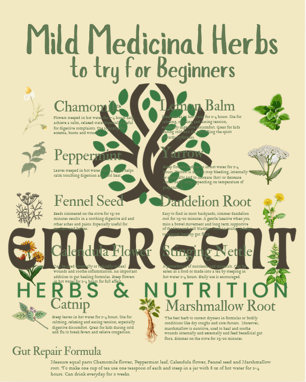 A one-page infographic outlining 10 mild herbs to begin using for the beginning herbalist and one formula.