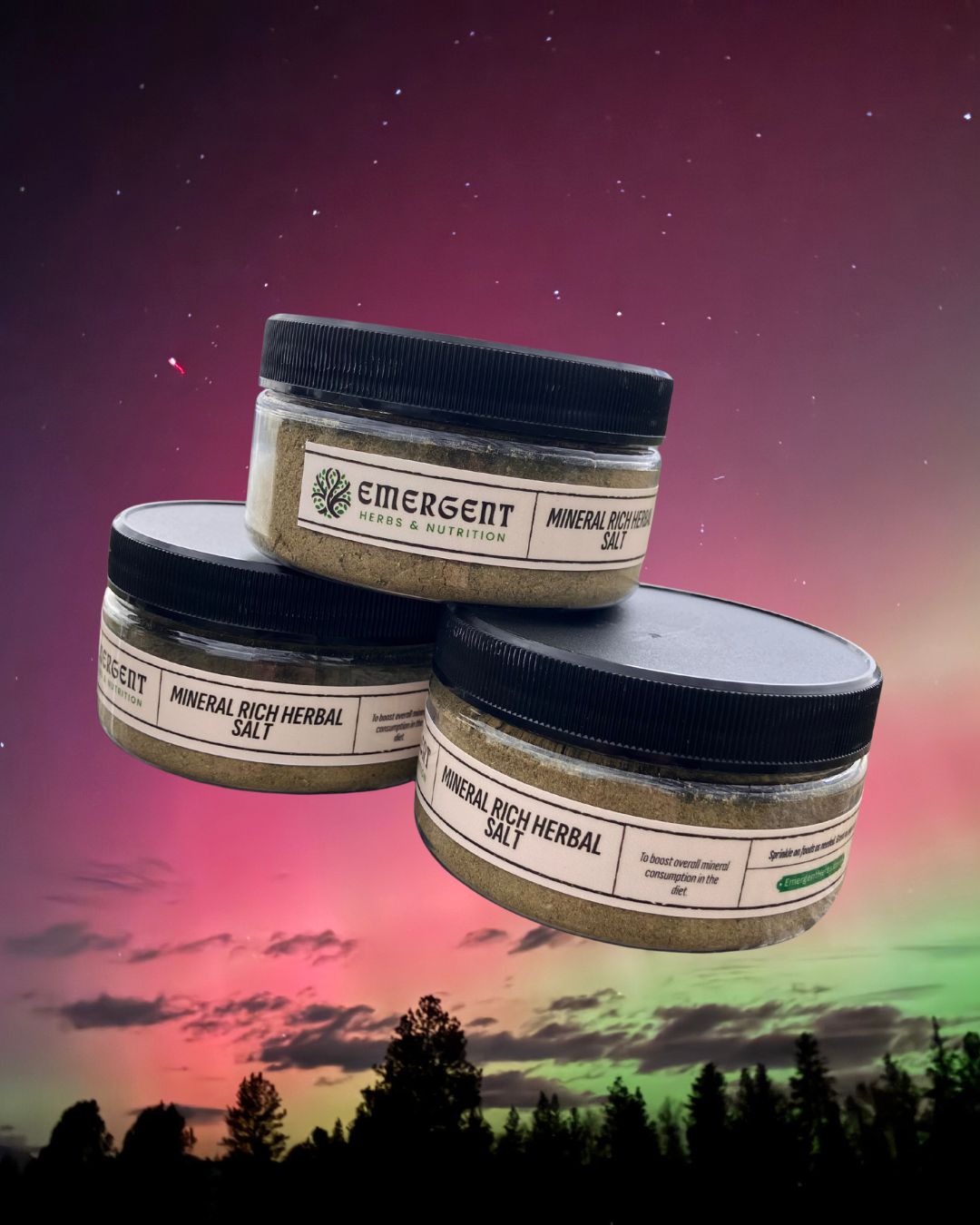 Salvia officinales (sage), Salvia rosmarinus (rosemary), Thymus vulgarus (thyme), Urtica dioica (nettle leaf), Ascophyllum nodosum (kelp), Ocimum (holy basil), Silybum marianum (milk thistle seed), Viola odorata (violet leaf), Carum carvi (caraway seed), Equisetum spp. (horsetail), Juniperus spp. (juniper berry), sea salt.