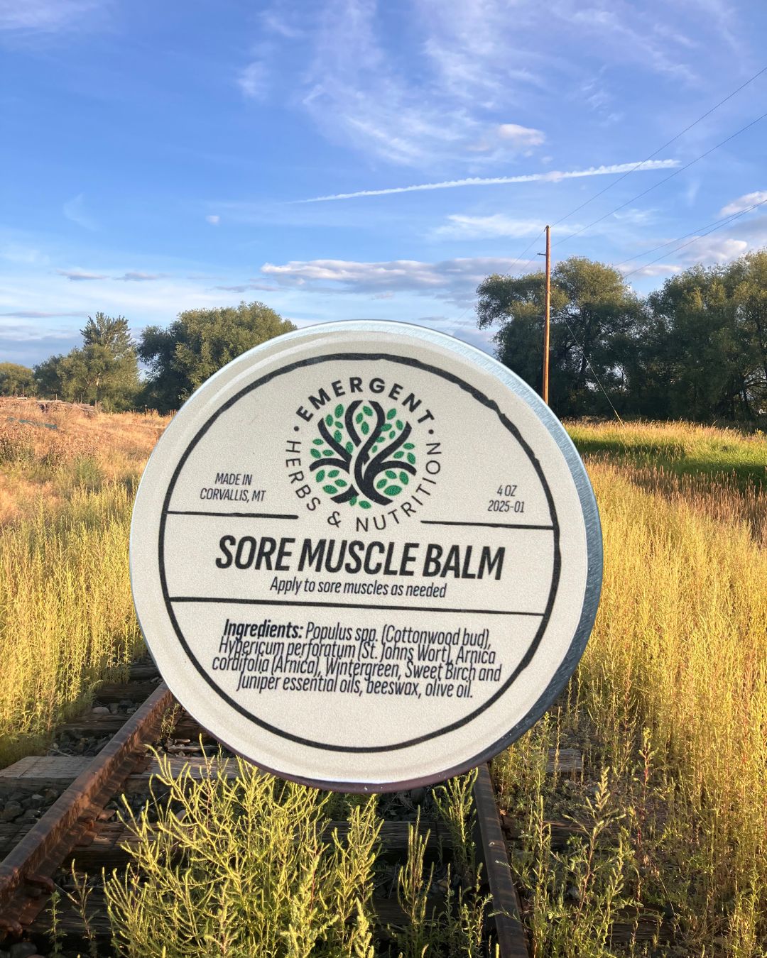 Populus spp. (cottonwood bud), Hypericum perforatum (st. john’s wort), Arnica cordifolia (arnica flower), wintergreen, sweet birch and juniper essential oils, beeswax, Organic olive oil.